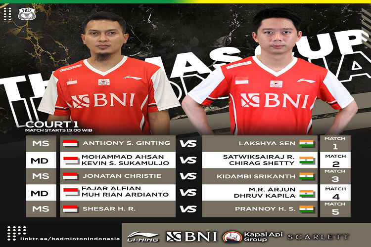 lalu Pada Match kedua tim India akan menurunkan pasangan Satwiksairaj R dan Chirag Shetty yang beradapan dengan Mohammad Ahsan dan Kevin S Sukamuljo.