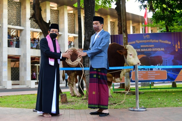 Pada Iduladha tahun ini, Presiden Jokowi juga menyerahkan hewan kurban di Masjid Istiqlal berupa seekor sapi berjenis Simental dengan bobot 1 ton. Tidak hanya di Masjid Istiqlal, Presiden Jokowi juga menyerahkan bantuan kemasyarakatan berupa hewan kurban di 34 provinsi di Indonesia.