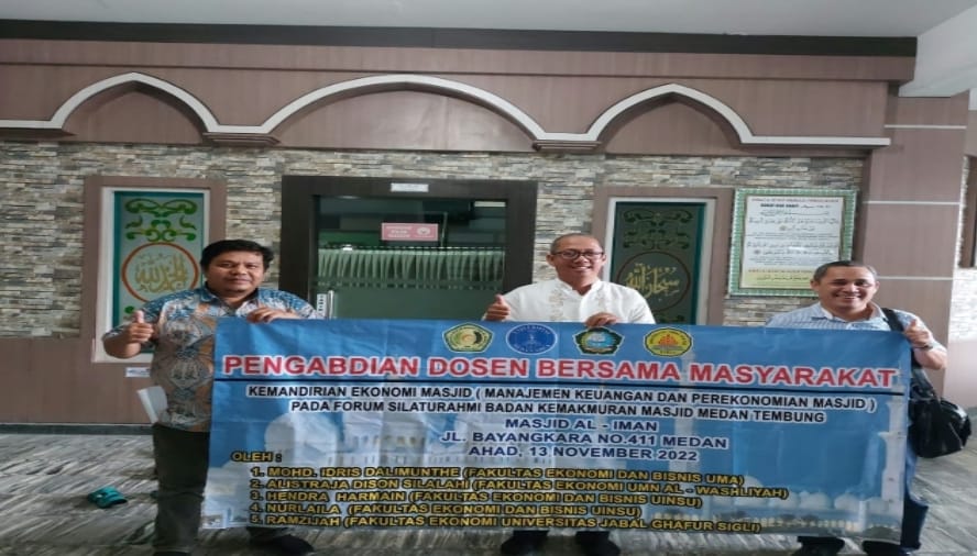 Dalam acara pelaksanaan pengabdian masyarakat dihadiri oleh Pengurus Forum Silaturahmi BKM Kecamatan Medan Tembung Bapak Dedy Sumarno, Ketua BKM Al Iman Bapak H. Abd. Hakim Siregar, M.Hum, tim pengajian ibu- ibu masjid Al Iman, mahasiswa dari Fakultas Ekonomi dan masyarakat di sekitar masjid. Dalam sambutan Ketua Fosil Kecamatan Medan Tembung menyambut sangat baik pelaksanaan pengabdian ini khususnya penggalian potensi kemandirian ekonomi jamaah di masjid. Hal senada juga disampaikan oleh Bapak Abdul Hakim Siregar selaku ketua BKM Al Iman agar pelaksanaan pengabdian ini berkelanjutan sehingga memberikan kebermanfaatan bagi masjid dan masyarakat terutama pembekalan keilmuan dan edukasi produk-produk investasi berbasis syariah. Dalam akhir sambutan beliau berharap agar pengurus BKM Al Iman dan pengurus Fosil diberikan pengetahuan dan pelatihan model investasi berbasis syariah tersebut termasuk tatacara untuk membuka maupun manajemen pengelolaannya, apalagi dengan kondisi saat ini, gotong royong adalah solusi yang tepat dalam pembiayaan.. Sebagai Ketua pelaksana pengabdian Bapak Mohd. Idris Dalimunthe dari FEB Universitas Medan Area, didampingi Alistraja Dison Silalahi dari FE UMN Al Washliyah, Hendra Harmain dan Nurlela  dari FEBI UINSU dan Ramzijah dari FE Universitas Jabal Ghafur Sigli. mengucapkan terimakasih kepada seluruh pihak yang telah membantu sehingga acara pengabdian masyarakat berjalan dengan lancar. Ucapan terimakasih khusus kepada Bapak Ketua BKM Masjid Al Iman, Bapak Ketua Fosil BKM Kecamatan Medan Tembung atas dukungan moral dan sritual sehingga acara pengabdian ini dapat terselenggara.