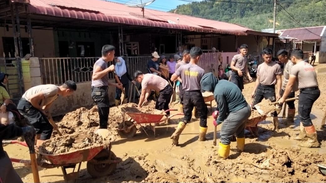 Personel bersama masyarakat membersihkan sampah, lumpur, dan material sisa yang berpotensi menimbulkan masalah kesehatan maupun lingkungan.