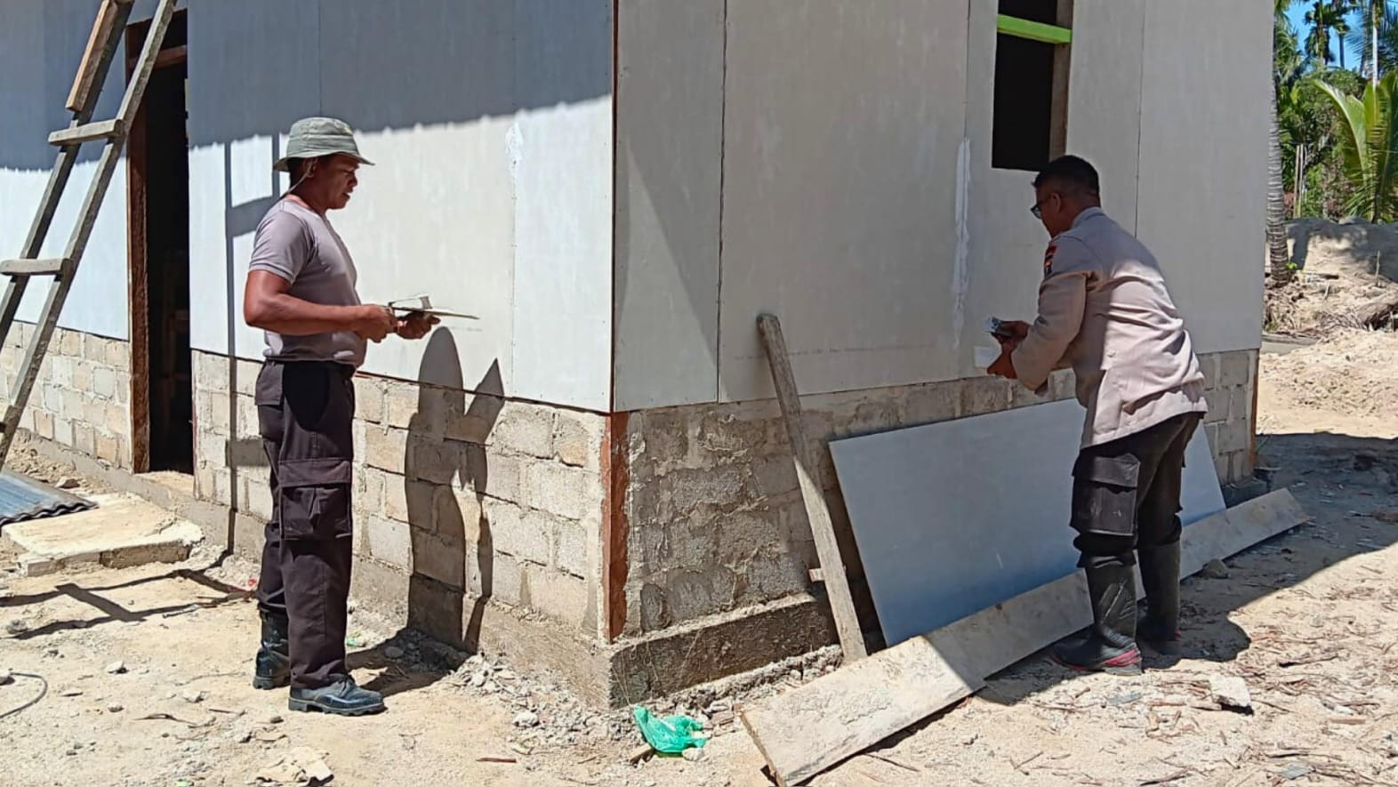 Personel Brimob bersama warga bergotong royong melakukan berbagai tahapan pekerjaan, mulai dari pembersihan area rumah swadaya, pendempulan dinding rumah hunian sementara berbahan IRC, hingga perataan tanah di sekitar lokasi pembangunan. Hingga saat ini, pembangunan hunian sementara telah mencapai unit ke-11 yang dikerjakan secara bertahap.