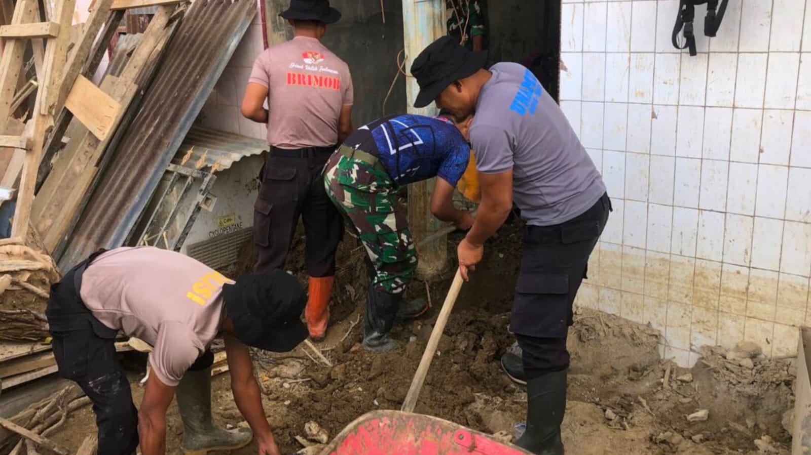 Selain itu, personel Brimob bersama unsur TNI bahu-membahu melakukan pembersihan sisa lumpur, material, dan puing bangunan di rumah warga. Pembersihan dilakukan di bagian samping rumah milik Bapak Kornel Simbolon dan dilanjutkan pada rumah Bapak Halomoan Manalu.